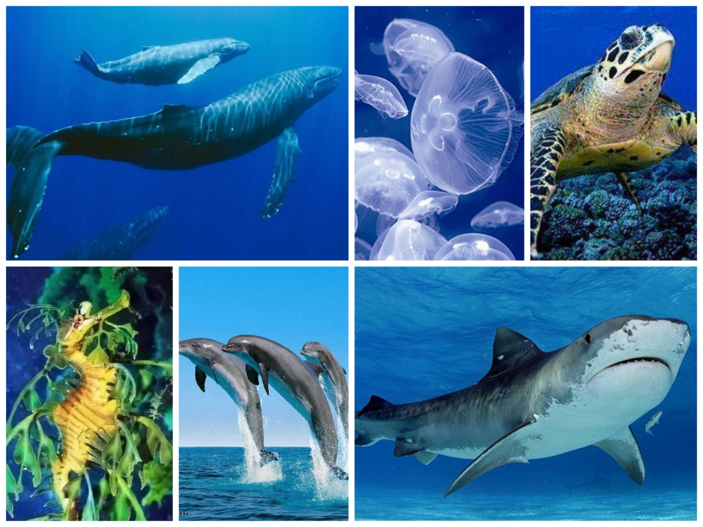 藍(lán)鯨、抹香鯨、海豚、海蛇、海龜、彈涂魚、蝠鲼、電鰩、鯊魚、蝴蝶魚、珊瑚魚、翻車魚、蝦蟹、藤壺、海兔、裸海蝶、紅魴魚、比目魚、海螺、扇貝、螃蟹、龍蝦、鯊魚、蝠鲼(重復(fù))、姥鯊、海豚、抹香鯨、海象
